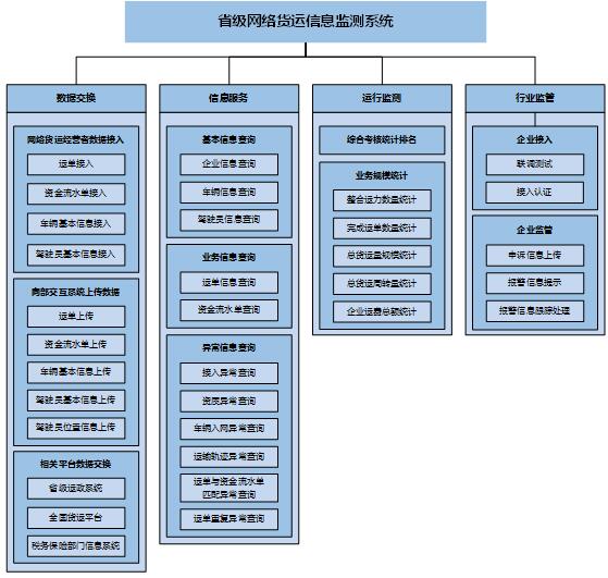省級(jí)監(jiān)測(cè)系統(tǒng)功能應(yīng)包括但不限于:數(shù)據(jù)交換、信息服務(wù)、運(yùn)行監(jiān)測(cè)、行業(yè)監(jiān)管等。各省份可結(jié)合本省實(shí)際業(yè)務(wù)需求和交通運(yùn)輸信息化的統(tǒng)一規(guī)劃,在滿足基本功能的基礎(chǔ)上,完善擴(kuò)展相關(guān)服務(wù)功能,提升網(wǎng)絡(luò)貨運(yùn)信息化水平。