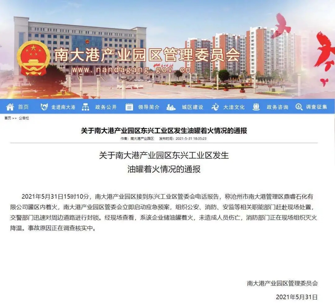 據(jù)河北滄州市南大港產(chǎn)業(yè)園區(qū)管理委員會官網(wǎng)消息,5月31日15時10分,南大港產(chǎn)業(yè)園區(qū)接到東興工業(yè)區(qū)管委會電話報告,稱滄州市南大港管理區(qū)鼎睿石化有限公司罐區(qū)內(nèi)著火,南大港產(chǎn)業(yè)園區(qū)管委會立即啟動應(yīng)急預(yù)案,組織公安、消防、安監(jiān)等相關(guān)職能部門趕赴現(xiàn)場處置,交警部門迅速對周邊道路進(jìn)行封鎖。
