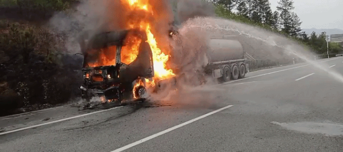 消防救援人員到場(chǎng)后發(fā)現(xiàn)槽罐車駕駛室呈猛烈燃燒狀態(tài),在對(duì)現(xiàn)場(chǎng)做好警戒的同時(shí),消防救援人員立即對(duì)火勢(shì)進(jìn)行撲救。