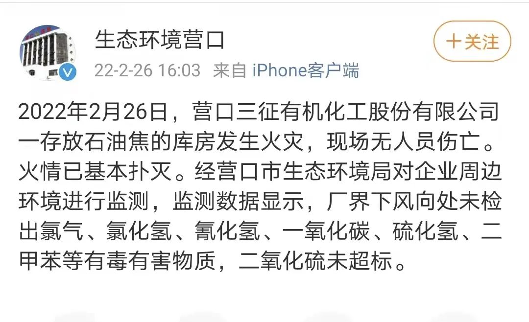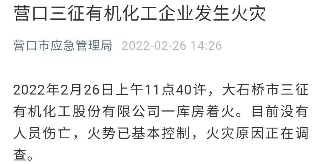 2022年2月26日上午11點(diǎn)40許,大石橋市三征有機(jī)化工股份有限公司一庫(kù)房著火。目前沒(méi)有人員傷亡,火勢(shì)已基本控制,火災(zāi)原因正在調(diào)查。 遼寧三征化學(xué)有限公司系三征有機(jī)化工股份有限公司的下屬公司。其官方網(wǎng)站信息顯示,該公司地址位于遼寧省大石橋市水源鎮(zhèn)黑英臺(tái)村,是國(guó)家農(nóng)藥定點(diǎn)生產(chǎn)企業(yè),是集原藥及制劑研發(fā)和生產(chǎn)于一體的現(xiàn)代化生產(chǎn)企業(yè),多年來(lái)專注于農(nóng)藥除草劑的開發(fā)應(yīng)用,擁有多種制劑產(chǎn)品,相繼開發(fā)了乳油、水劑、懸乳劑、油懸劑、微乳劑、可濕性粉劑、水分散粒劑等多種劑型,產(chǎn)品涵蓋了玉米、大豆、水稻、花生、甘蔗、和經(jīng)濟(jì)作物等多種除草劑品種60多個(gè),規(guī)格400多種,年生產(chǎn)能力原藥1萬(wàn)噸,制劑3.5萬(wàn)噸。 2月26日下午,記者多次撥打遼寧三征化學(xué)有限公司官方網(wǎng)站上公布的辦公電話,均顯示電話已關(guān)機(jī)。 大石橋市水源鎮(zhèn)鎮(zhèn)政府工作人員告訴記者,當(dāng)?shù)氐娜骰瘜W(xué)確實(shí)出了事故,目前有關(guān)部門的領(lǐng)導(dǎo)都在現(xiàn)場(chǎng)參與救援,但有無(wú)人員受傷等詳細(xì)情況他均不清楚。