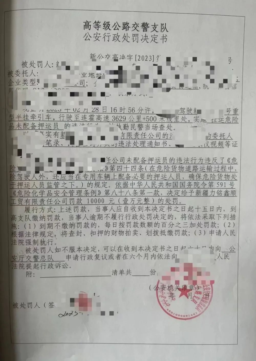 3月6日下午,新疆公安廳交警總隊高等級公路支隊烏西大隊違法處理室內,新疆力銘鑫順工貿有限責任公司的委托人鄔某正在代表該公司處理違法行為,仔細一看行政處罰決定書上的罰款居然高達一萬元,不禁讓人感到好奇,到底是什么違法行為罰款金額如此之高? 原來,2023年2月28日17時許,高支隊烏西大隊民警在轄區(qū)G30連霍高速頭屯河收費站開展春節(jié)守護行動“兩客一!睓z查登記時,在對一輛新G牌照的;愤\輸車檢查過程中,發(fā)現該車駕駛室僅有一人,無危化品車輛押運員隨車押運,就在民警詢問過程中,又一輛新G牌照的;奋囻倎恚洐z查發(fā)現此車同樣未配備押運人員。 經核實,兩車均系新疆力銘鑫順工貿有限責任公司名下車輛,據兩名駕駛人描述,因公司未配備押運員,自己也沒有多問,想著應該沒事,沒想到會被交警查到。民警對兩名駕駛人進行了嚴厲的批評教育,分別開具了違法處理通知書,并要求所屬公司負責人到大隊接受處理。 于是這才有了開頭的一幕,通過詢問鄔某得知,兩車拉運的均為液化天然氣從烏魯木齊市前往獨山子,由于公司培訓的押運員沒有達到上崗要求,尚未取得;费哼\從業(yè)資格證,所以沒有配備押運員。 根據《危險貨物道路運輸管理辦法》第四十四條相關規(guī)定,在危險貨物道路運輸過程中,除駕駛人外,還應當在專用車輛上配備必要的押運人員,確保危險貨物處于押運人員的監(jiān)管之下的規(guī)定,民警依法對該公司名下的兩車駕駛人實施通過道路運輸危險化學品不配備押運人員的違法行為分別處以罰款一萬元的處罰,合計罰款共兩萬元。 高速交警提示 運載;奋囕v要嚴格遵守運輸要求,取得;愤\載資質,司機要有;愤\輸從業(yè)資質,且要隨車配備有相應資質的押運員。若車輛在行駛途中出現危化品泄漏等緊急情況,押運員可以做出應急措施。;愤\輸押運人員對;愤\輸進行全程監(jiān)督,對行車安全起到了至關重要的作用,相關從業(yè)人員和企業(yè)務必重視!