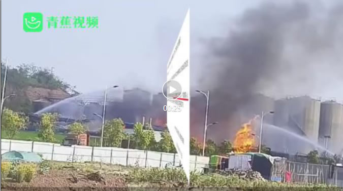 現(xiàn)場(chǎng)畫(huà)面顯示,酒廠(chǎng)園區(qū)內(nèi)燃起熊熊大火,濃煙滾滾,火光沖天伴有爆炸聲,儲(chǔ)存罐被煙火熏黑,消防人員正在用高壓水槍滅火,警報(bào)聲轟鳴。