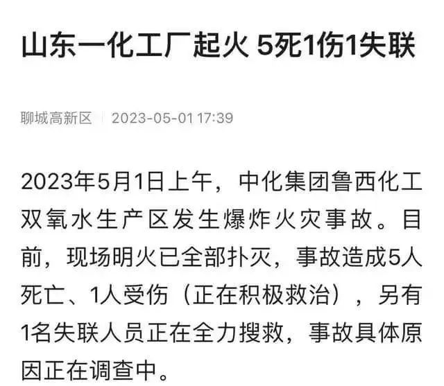 下午5點39分,據(jù)魯西化工所在地聊城市高新區(qū)官方發(fā)布,中化集團魯西化工雙氧水生產(chǎn)區(qū)發(fā)生的爆炸火災事故,已經(jīng)造成了5人死亡、1人受傷,另有1名失聯(lián)人員正在全力搜救。
