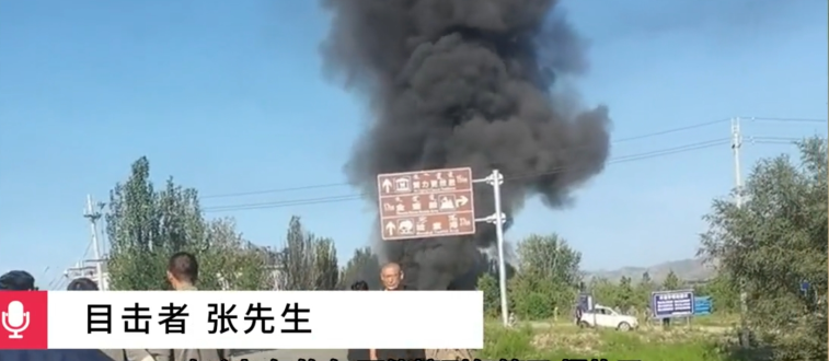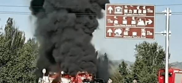 視頻顯示,至少有三輛大車并排停在公路上,車身起火冒起濃煙,路牌顯示事故地點(diǎn)距離賈力更故居15公里。拍攝者身處一片草叢中,遠(yuǎn)處火焰熊熊燃燒,黑煙漫天,同時(shí)傳出爆炸聲響。