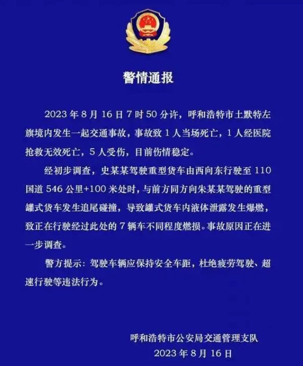 8月16日,呼和浩特市土默特左旗一輛重型;饭捃嚺c多車相撞,發(fā)生爆燃,事故造成2人死亡,5人受傷。