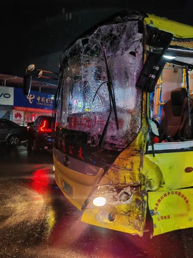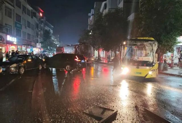 事發(fā)現(xiàn)場(chǎng)視頻畫(huà)面顯示,夜幕下,正下著雨,一輛車頭受損的公交車斜停在路中間,旁邊是一輛車尾已出現(xiàn)變形的油罐車,中間還有兩輛不同程度碰撞受損的私家車,現(xiàn)場(chǎng)散落著不少玻璃和零件碎片,引起了群眾圍觀,隨后有救護(hù)車到場(chǎng)。