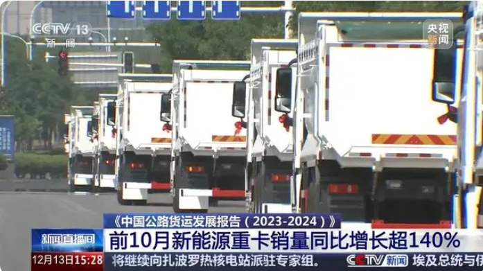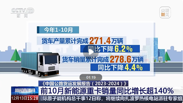 根據(jù)《中國公路貨運發(fā)展報告(2023—2024)》,今年1—10月,我國貨車產銷量累計均超過270萬輛,其中新能源重卡銷量增長明顯,同比增長超過140%。