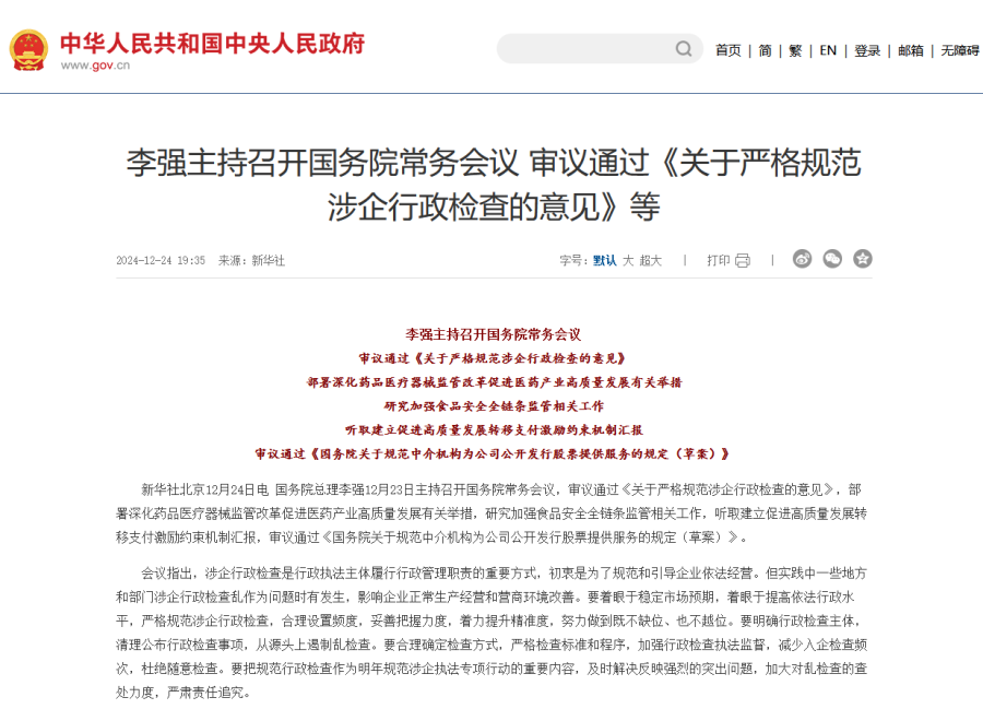 國務(wù)院總理李強12月23日主持召開國務(wù)院常務(wù)會議,審議通過《關(guān)于嚴(yán)格規(guī)范涉企行政檢查的意見》,部署深化藥品醫(yī)療器械監(jiān)管改革促進(jìn)醫(yī)藥產(chǎn)業(yè)高質(zhì)量發(fā)展有關(guān)舉措,研究加強食品安全全鏈條監(jiān)管相關(guān)工作,聽取建立促進(jìn)高質(zhì)量發(fā)展轉(zhuǎn)移支付激勵約束機制匯報,審議通過《國務(wù)院關(guān)于規(guī)范中介機構(gòu)為公司公開發(fā)行股票提供服務(wù)的規(guī)定(草案)》。 會議指出,涉企行政檢查是行政執(zhí)法主體履行行政管理職責(zé)的重要方式,初衷是為了規(guī)范和引導(dǎo)企業(yè)依法經(jīng)營。但實踐中一些地方和部門涉企行政檢查亂作為問題時有發(fā)生,影響企業(yè)正常生產(chǎn)經(jīng)營和營商環(huán)境改善。要著眼于穩(wěn)定市場預(yù)期,著眼于提高依法行政水平,嚴(yán)格規(guī)范涉企行政檢查,合理設(shè)置頻度,妥善把握力度,著力提升精準(zhǔn)度,努力做到既不缺位、也不越位。要明確行政檢查主體,清理公布行政檢查事項,從源頭上遏制亂檢查。要合理確定檢查方式,嚴(yán)格檢查標(biāo)準(zhǔn)和程序,加強行政檢查執(zhí)法監(jiān)督,減少入企檢查頻次,杜絕隨意檢查。要把規(guī)范行政檢查作為明年規(guī)范涉企執(zhí)法專項行動的重要內(nèi)容,及時解決反映強烈的突出問題,加大對亂檢查的查處力度,嚴(yán)肅責(zé)任追究。 會議還研究了其他事項。
