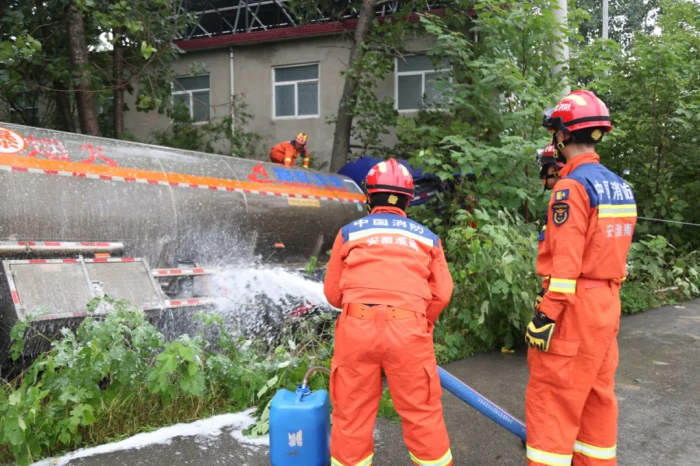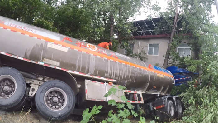 6月7日11時許,淮南市大通區(qū)206國道萬家崗村路段發(fā)生驚險一幕,兩輛大貨車在雨中行駛時,因路面濕滑,避讓不及發(fā)生碰撞。其中載有30余噸汽油的油罐車側翻至路邊樹林,駕駛員被困變形駕駛室,情況萬分危急。