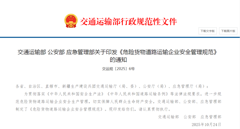 近日,交通運(yùn)輸部會(huì)同公安部、應(yīng)急管理部發(fā)布了《危險(xiǎn)貨物道路運(yùn)輸企業(yè)安全管理規(guī)范》(交運(yùn)規(guī)〔2025〕6號(hào),以下簡(jiǎn)稱《規(guī)范》),自印發(fā)之日起施行。 一、制定背景近年來,危險(xiǎn)貨物道路運(yùn)輸重特大安全生產(chǎn)事故雖得到初步遏制,但一般及以下事故仍多發(fā)頻發(fā),暴露出行業(yè)安全管理還存在問題和短板,需要進(jìn)一步加強(qiáng)危險(xiǎn)貨物道路運(yùn)輸企業(yè)安全生產(chǎn)管理,保障危險(xiǎn)貨物道路運(yùn)輸安全。為此,我部組織全面系統(tǒng)梳理了現(xiàn)行法律法規(guī)、標(biāo)準(zhǔn)規(guī)范有關(guān)危險(xiǎn)貨物道路運(yùn)輸安全生產(chǎn)管理要求,經(jīng)深入調(diào)研、充分論證并廣泛征求意見,研究制定了《規(guī)范》。 二、《規(guī)范》主要內(nèi)容《規(guī)范》共7章75條,主要包括以下內(nèi)容: 一是夯實(shí)安全生產(chǎn)基礎(chǔ)。明確了安全生產(chǎn)管理機(jī)構(gòu)和專職安全生產(chǎn)管理人員配備標(biāo)準(zhǔn)和要求,“兩類人員”(主要負(fù)責(zé)人和安全生產(chǎn)管理人員)安全考核要求,以及安全例會(huì)和安全生產(chǎn)工作會(huì)議要求。完善了安全生產(chǎn)費(fèi)用支出范圍。 二是明確安全生產(chǎn)職責(zé)。細(xì)化了危險(xiǎn)貨物道路運(yùn)輸企業(yè)主要負(fù)責(zé)人、安全生產(chǎn)管理機(jī)構(gòu)和安全生產(chǎn)管理人員職責(zé)。要求危險(xiǎn)貨物道路運(yùn)輸企業(yè)將全員安全生產(chǎn)責(zé)任層層分解,明確責(zé)任人員、責(zé)任范圍、考核標(biāo)準(zhǔn)和監(jiān)督考核,保證安全生產(chǎn)責(zé)任制度落實(shí)。 三是完善安全生產(chǎn)制度。對(duì)危險(xiǎn)貨物道路運(yùn)輸企業(yè)、從業(yè)人員、車輛設(shè)備、安全生產(chǎn)操作規(guī)程、應(yīng)急處置、停車場(chǎng)管理等進(jìn)行了規(guī)范。完善了從業(yè)人員安全管理、從業(yè)人員安全生產(chǎn)教育和培訓(xùn)、車輛技術(shù)管理、應(yīng)急救援預(yù)案管理、安全生產(chǎn)年度考核與獎(jiǎng)懲等制度,細(xì)化了相關(guān)檔案管理要求。明確了駕駛員聘用條件,要求加強(qiáng)駕駛員心理疏導(dǎo)、精神慰藉,定期開展從業(yè)人員職業(yè)健康檢查,防范駕駛員行為異常。細(xì)化了危貨車輛應(yīng)急裝備、器材和個(gè)人防護(hù)用品配備要求。明確了危險(xiǎn)貨物道路運(yùn)輸車輛停車場(chǎng)管理要求。 ;愤\(yùn)輸車專用導(dǎo)航識(shí)別二維碼即可免費(fèi)使用四是細(xì)化運(yùn)輸管理要求。對(duì)基礎(chǔ)作業(yè)規(guī)范、電子運(yùn)單制作及使用、車輛動(dòng)態(tài)監(jiān)控管理制度等進(jìn)行了系統(tǒng)規(guī)定。鼓勵(lì)危險(xiǎn)貨物道路運(yùn)輸企業(yè)在開展新業(yè)務(wù)(新路線)前進(jìn)行實(shí)際運(yùn)輸線路風(fēng)險(xiǎn)評(píng)估,識(shí)別安全風(fēng)險(xiǎn),制定相應(yīng)的防范措施并有效落實(shí)。明確使用常壓液體危險(xiǎn)貨物罐車運(yùn)輸危險(xiǎn)貨物時(shí),應(yīng)當(dāng)在罐式車輛“道路運(yùn)輸證”經(jīng)營范圍和罐式車輛罐體定期檢檢報(bào)告中罐體適裝介質(zhì)列表范圍內(nèi)承運(yùn)。 細(xì)化了電子運(yùn)單填報(bào)的禁止情形。要求危險(xiǎn)貨物道路運(yùn)輸企業(yè)按照“兩客一危”車輛安全碼賦碼規(guī)則等要求,加強(qiáng)對(duì)紅碼和黃碼危險(xiǎn)貨物道路運(yùn)輸車輛的精準(zhǔn)管理。五是強(qiáng)化了雙重預(yù)防機(jī)制。明確了安全風(fēng)險(xiǎn)分級(jí)管控和隱患排查治理具體要求。要求危險(xiǎn)貨物道路運(yùn)輸企業(yè)每年至少開展1次全面風(fēng)險(xiǎn)辨識(shí)評(píng)估,每月至少開展1次生產(chǎn)安全事故隱患排查工作,并建立生產(chǎn)安全事故隱患排查治理長效機(jī)制。