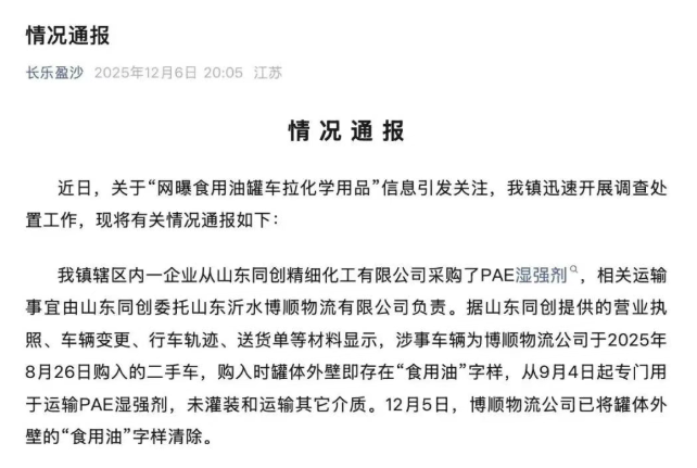 近日,江蘇如東縣長沙鎮(zhèn)人民政府官方微信號“長樂盈沙”發(fā)布情況通報: 近日,關于“網(wǎng)曝食用油罐車拉化學用品”信息引發(fā)關注,我鎮(zhèn)迅速開展調查處置工作,現(xiàn)將有關情況通報如下: 我鎮(zhèn)轄區(qū)內一企業(yè)從山東同創(chuàng)精細化工有限公司采購了PAE濕強劑,相關運輸事宜由山東同創(chuàng)委托山東沂水博順物流有限公司負責。據(jù)山東同創(chuàng)提供的營業(yè)執(zhí)照、車輛變更、行車軌跡、送貨單等材料顯示,涉事車輛為博順物流公司于2025年8月26日購入的二手車,購入時罐體外壁即存在“食用油”字樣,從9月4日起專門用于運輸PAE濕強劑,未灌裝和運輸其它介質。12月5日,博順物流公司已將罐體外壁的“食用油”字樣清除。 經(jīng)我鎮(zhèn)聯(lián)合縣市監(jiān)、交通、公安等部門及洋口港經(jīng)濟開發(fā)區(qū)對涉事車輛在我縣境內情況進行核查,該車輛手續(xù)齊全,未發(fā)現(xiàn)其灌裝及運輸食用油情況。衷心感謝社會各界和網(wǎng)民關注監(jiān)督,我鎮(zhèn)將加強管理,杜絕類似情況發(fā)生。